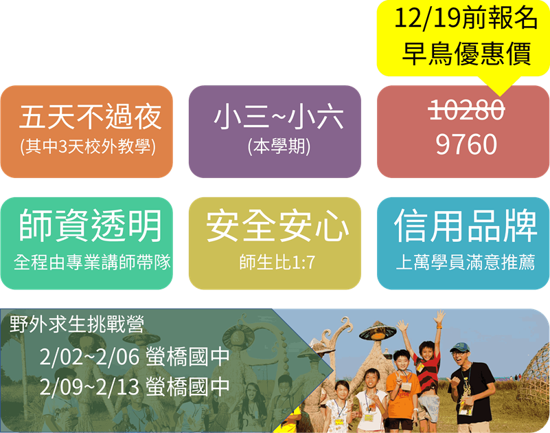 透過示範、學習與實際操作,激發孩子們的潛能;透過互助、互信與溝通,培養團隊合作精神。讓我們一起在大自然中成長,成為真正的求生達人!