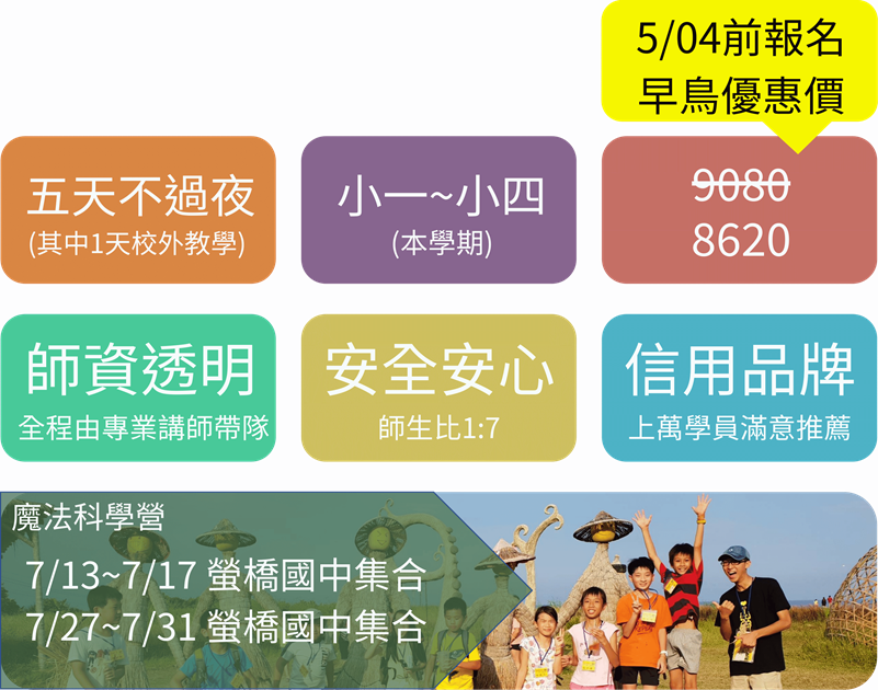 當科學披上魔法的外衣,學習將不再枯燥。讓孩子走進科學的奇幻世界,探索牛頓、阿基米德、愛因斯坦與富蘭克林的科學魔法!五天的魔法科學營,結合STEAM教育與手作活動,帶孩子從錯覺屋到靜電實驗,感受科學的趣味與創意!讓孩子動手做中學、激發好奇心的冒險!本課程由兒童科學讀物<親子FUN科學>、<STEAM大挑戰、<科學玩具總動員>暢銷作者許兆芳老師設計,由教學經驗豐富的BABY老師帶領,科學課程到處都有,但真正落實 STEAM 精神,而不只是單純組裝材料包的營隊,才是您的首選。