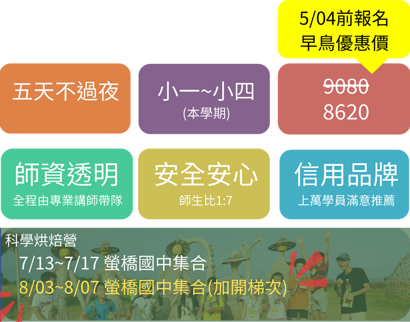 加入我們,陪孩子一起透過實作培養伴隨一生的「科學觀察力」與「問題解決力」 !五天過後,孩子帶回家的不只是誘人蛋糕,更是一顆對世界充滿好奇、持續發酵的科學之心 。