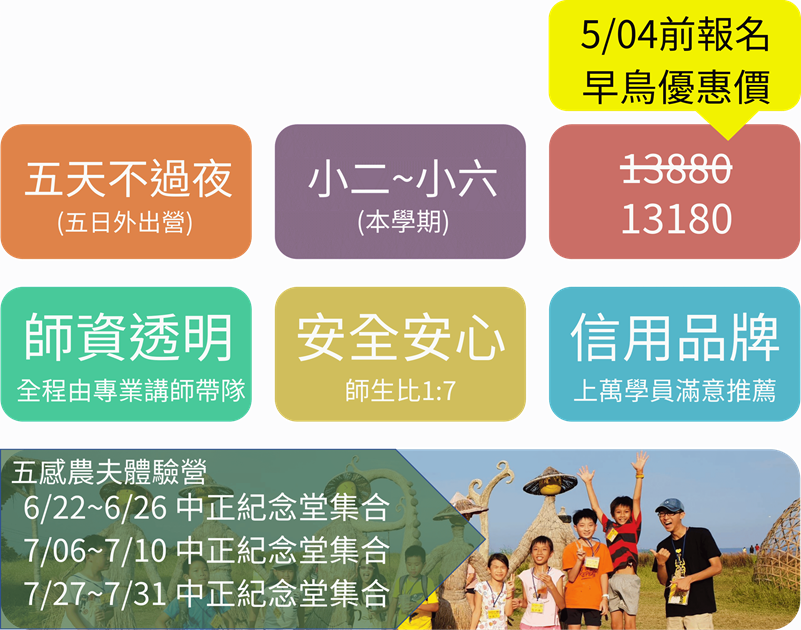 暑假,讓孩子脫下厚重外套,換上雨鞋,和我們一起奔向廣闊的田野!這不只是一趟出遊,而是一場結合「五感體驗」與「生命探索」的深度之旅。我們將帶孩子從台北出發,走訪桃園、新北的優質農場與職人據點,從有機蔬果、蜜蜂生態、稻作文化,到可愛動物與傳統米食手作。在五天的时间裡,孩子將親手觸摸土地、觀察自然奧秘、與動物交朋友,並帶回滿滿的知識與親手製作的紀念品,為暑假留下最難忘的成長回憶!