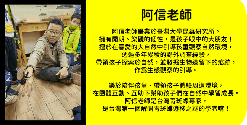 由台灣青斑蝶專家——阿信老師帶領,孩子們將遠離都市塵囂,深入果園與山林,探詢那些隱藏在草叢間、樹葉下的小小六足訪客。這不僅是一次生態觀察的冒險,更是一場培養孩子觀察力、專注力與團隊合作精神的成長之旅!