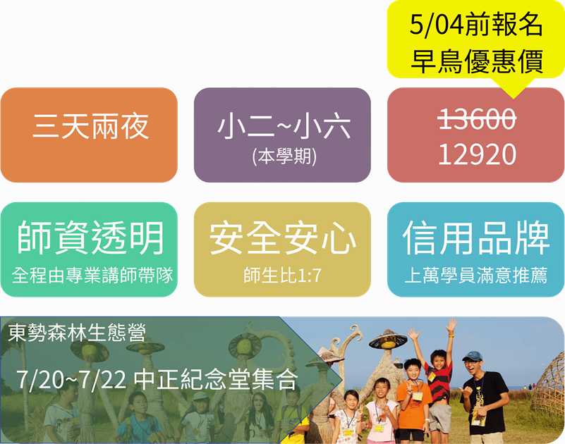 獨立成長與團隊合作: 離開舒適圈的三天兩夜,融入小隊分工任務,培養孩子的生活自理能力、解決問題的勇氣與互助合作精神。