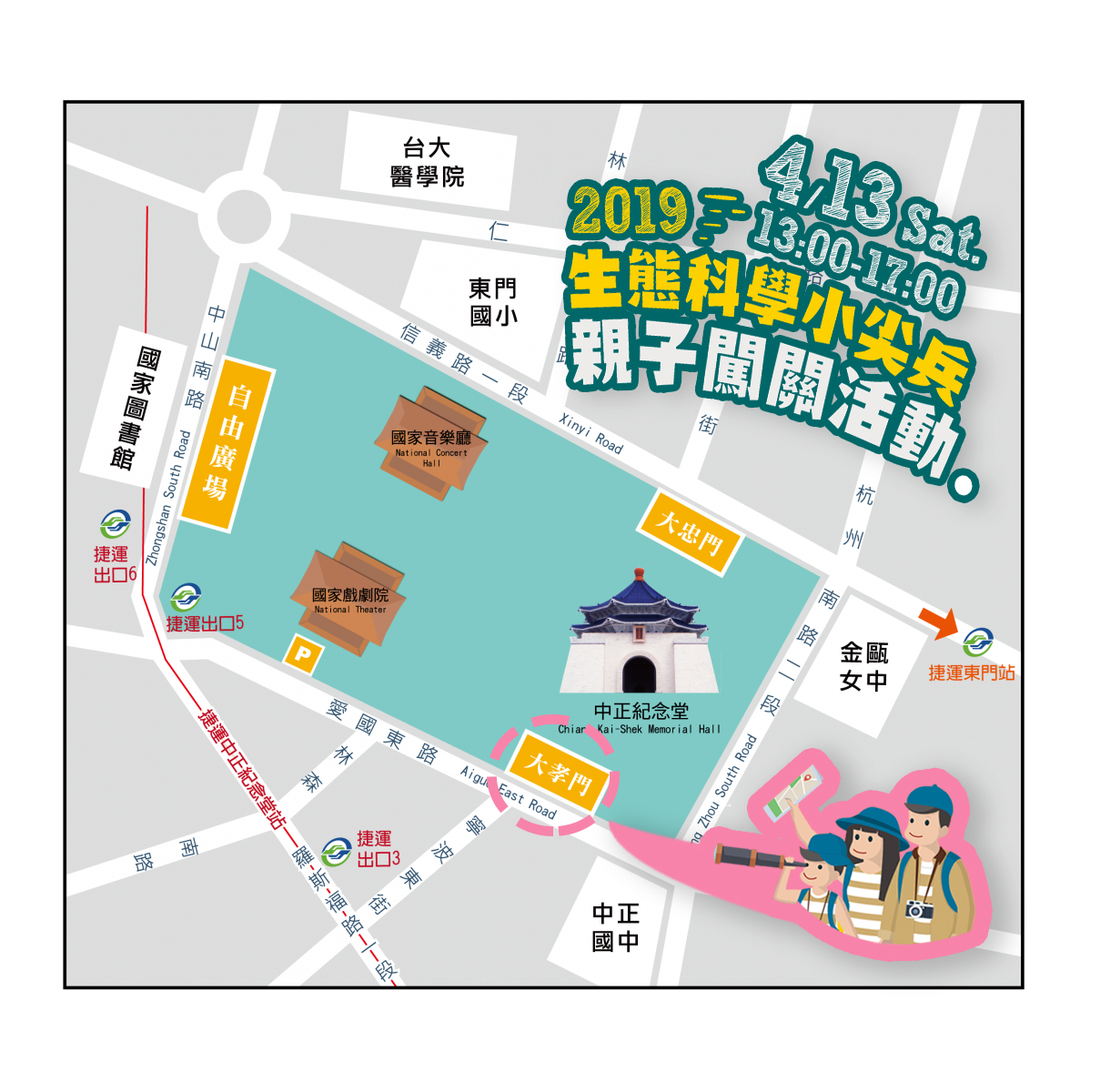 📢 生態科學小尖兵們,集合! 🚩 本周六4月13日,eye上大自然將要舉辦 #免費的親子闖關活動囉! 運用你的智慧與勇氣,通過重重關卡,獲得寶藏吧! ⧓ 地點:中正紀念堂 #大孝門(愛國東路側) ⧓ 時間:#下午一點 開始 ⧓ 對象:幼兒園及國小親子 ⧓ 方式:至活動服務台索取闖關卡即可參加 ●○●○●○●○豐富大獎等你來拿●○●○●○●○ 共有十個關卡,每個關卡都有講師與隊輔哥哥姊姊協助說明與協助,歡迎爸爸媽媽帶小朋友們一起來參加,度過一個美好的周末午後🥰